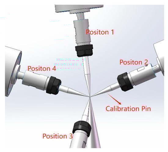 (1) Determine calibration points: A calibration needle is fixed on the optical platform, with its tip position designated as P. Control the robot to position the tool end-effector at point P with four distinct orientations, as illustrated in