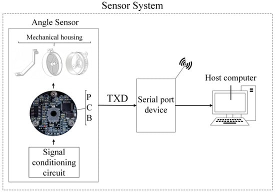 The proposed angle measurement system consists of three parts: the angle sensor, a serial device, and a host computer. Specifically, the angle sensor includes a signal conditioning circuit, a PCB, and a mechanical housing. The signal conditioning circuit is integrated into the PCB, which is secured to the mechanical housing by three screws, responsible for collecting angle data and transmitting it to the serial device. Upon receiving the data, the serial device sends it to the host computer via the recommended standard 232 (RS-232) [23] or universal serial bus to universal asynchronous receiver/transmitter (USB-UART) protocols. Finally, the user reads the sensor data from the host computer. The overall system architecture is shown in Figure 1.