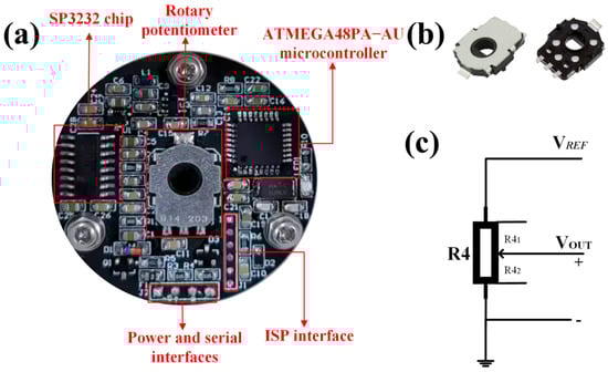 The core circuit of the system is shown in Figure 2a, which mainly consists of a rotary potentiometer, a microcontroller, a SP3232 chip, an in-system programming (ISP) interface, a power and serial interface, and a signal conditioning circuit. The microcontroller is software-programmed and flashed to the core board via an ISP burner and an ISP interface. The system measures relative angular displacement in industrial control systems by acquiring the sensor’s linear voltage output. The principle of operation is based on the linear relationship between the angular displacement of the rotary potentiometer and the change in its resistance value: when the rotary shaft undergoes mechanical displacement, the potentiometer’s resistance changes, causing the sensor to generate a linear voltage output corresponding to the rotation angle. The voltage output increases linearly with the rotation angle [15]. The rotary potentiometer used is the EVWAE4001B14 from PANASONIC, with an electrical rotation angle range of 0–343°, capable of operating 1 million cycles. Its overall maximum size tolerance is 0.6 mm, and the maximum size tolerance of the center hole is 0.2 mm, as shown in Figure 2b. The topological structure of the device’s moving contact equivalent circuit is shown in Figure 2c. According to the standard voltage divider principle, the output voltage Vout can be expressed as follows: