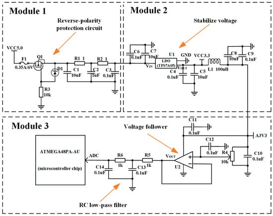 The circuit design of the sensor is the system’s core. Excellent hardware circuit design reduces the production cost while ensuring the measurement accuracy and also lays the foundation for the hysteresis error compensation. The specific circuit diagram is shown in Figure 3. The circuit can be divided into three modules, which collectively achieve sensor voltage acquisition, filtering, voltage conversion and regulation, protection, and communication with the host computer. In Module 1, the fuse F1, metal–oxide–semiconductor field-effect transistor (MOSFET) Q1, and Zener diode D1 form a reverse-polarity protection circuit to prevent incorrect polarity connection at the input terminals. Decoupling capacitors C1, C2, and C3, along with resistors R1 and R2, are employed for conducting power supply filtering to ensure a stable 5 V DC output voltage. Module 2 incorporates a low-dropout regulator (LDO, TPS7A05) to convert the 5 V DC voltage into a stable 3.3 V DC voltage, which powers the rotary potentiometer, the operational amplifier U2, and the microcontroller. The output voltage temperature coefficient of this LDO is ±50 ppm/°C, thus improving the temperature stability of voltages. Its extremely low output voltage noise (7.8 μV RMS) and high PSRR (55 dB at 1 Mhz) at high frequencies suppress electromagnetic noise. Decoupling capacitors C4, C5, C6, C7, C8, and C9 and inductor L1 are used for filtering. Module 3, as previously mentioned, includes the wiper circuit. Its output voltage is routed through a buffering circuit implemented with the MCP6V91T-E/OT from Microchip, then transmitted to the microcontroller’s built-in ADC pin for real-time sampling. Finally, the microcontroller processes the signal and uploads the data to the host computer via a serial device. The MCP6V91T-E/OT functions as a voltage follower, isolating the resistive voltage divider network formed by the rotary potentiometer from the subsequent circuit. This eliminates the impact of load effects on the voltage division ratio while simultaneously suppressing the output voltage noise from the rotary potentiometer. By providing a stable signal source for the microcontroller’s built-in ADC, it enhances measurement accuracy. The input offset voltage temperature drift of the operational amplifier is extremely low, i.e., only ±17 nV/°C. Moreover, its internal design includes an EMI suppression circuit, and its EMI suppression ratio at high frequency (1.8 Ghz) reaches 93 dB, which further suppresses the electromagnetic noise. Capacitors C13 and C14, in conjunction with resistors R5 and R6, form a second-order passive RC low-pass filter, with a cutoff frequency of approximately 1591.5 Hz. It can effectively filter out high-frequency interference, enhancing signal stability. Decoupling capacitors C10, C11, and C12 are used for filtering.