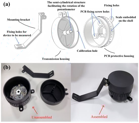 The mechanical housing of the sensor has been specially designed, which contains the mounting bracket, transmission housing, and PCB protective housing. Materials such as metal, nylon, and resin can be selected according to actual application needs. The mounting bracket, fixed on the device under test via screw holes and screws, ensures a secure connection. The semi-cylindrical structure in the transmission housing is embedded into the semi-circular hole in the center of the rotating potentiometer. The rotation of the industrial equipment to be measured drives the transmission housing, converting mechanical motion into potentiometer angular displacement via the semi-cylindrical structure. The PCB is fixed to the PCB protective housing with three screws positioned at mutual 120° angles. Moreover, the calibration hole on the transmission housing and the scale inlaid in the protective housing are utilized for angle calibration and demarcation. With the scale marked every 5°, the current angle can be determined once their centers are aligned. This unique design simplifies the manual angle calibration process. The overall design of the mechanical housing is shown in Figure 4a. Figure 4b presents the photograph of the sensor’s mechanical housing.