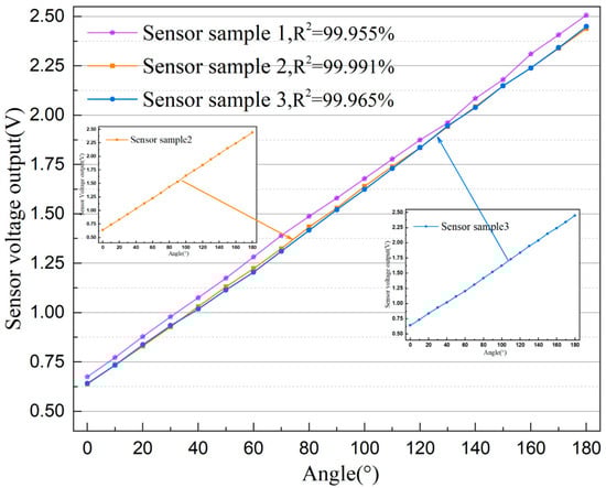 where θV is the angle value per unit voltage within the sensor’s span, and Δθ is the angle change during measurement. Vmax and Vmin are the average maximum and minimum output voltages measured in the experiment.