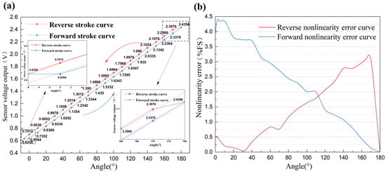 (a) The sensor output voltage curves for both forward and reverse strokes; (b) the nonlinearity error curves for both forward and reverse strokes.