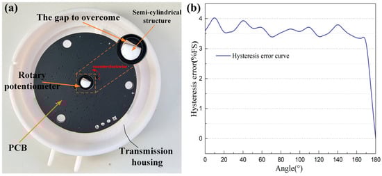 The test procedure and conditions are similar to those in Section 3.1, with the following differences: The transmission housing was pushed in the opposite direction upon reaching 180° until the sensor output voltage returned to the initial value, after which the direction was reversed again. This operation was repeated five times with the sensor voltage output recorded at each sampling point during both the forward (angle increasing) and reverse (angle decreasing) strokes. Finally, the experimental data were averaged to generate the forward and reverse stroke curves, as shown in Figure 6a. The average data from 0° to 180° during both forward and reverse strokes were separately linear-fitted, and the forward-stroke equation for sensor output voltage as a function of angle can be expressed as follows: