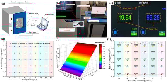 (a) The schematic diagram of the test platform; (b) the photograph of the test platform; (c) the GUI of the chamber (d) the output voltage curves of the sensor at different angles and temperatures; (e) the three-dimensional surface plot of the sensor output voltage as a function of both angular position and temperature; (f) the output voltage curves of the sensor at different angles and relative humidity.