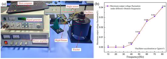 The mechanical vibration test aims to simulate the mechanical vibration environment of actual industrial sites and evaluate the measurement accuracy stability and structural reliability of the angle sensor under different frequencies and amplitudes. This study conducted the mechanical vibration test on the angle sensor in accordance with the IEC 60068-2-6 standard [32]. The test platform, as shown in Figure 9a, mainly including devices such as the SA-SG030 signal generator (Wuxi Shiao, China), SA-PA020 power amplifier (Wuxi Shiao, China), and SA-JZ002 exciter (Wuxi Shiao, China). As described in Section 3.4, the influence of temperature and humidity on the sensor is almost negligible, so the experiment was conducted at room temperature. Most industrial equipment typically vibrates at frequencies from 0 to 100 Hz and with small amplitudes, so this paper focuses on investigating the effect of vibration frequency on the sensor performance. During the experiment, the sensor was horizontally placed on the oscillator of the exciter (the angle sensor is mainly used for angle measurement in the horizontal direction) and fixed with a rigid fixture to make it vibrate near the central position of the oscillator. The acceleration of the exciter oscillator was controlled at 2 g through the collaborative operation of a power amplifier and a supporting acceleration sensor. The sine wave excitation signals of different frequencies were applied to the exciter oscillator where the sensor was located using a signal generator, in order to simulate the periodic mechanical vibration of equipment in industrial environments and drive the sensor to generate expected vibrations. Before each application of the excitation signal, the transmission housing of the sensor was rotated to an appropriate position to stabilize its output voltage. Then, excitation signals with different frequencies from 0 to 80 Hz were applied at 10 Hz steps, allowing the sensor to vibrate for 1 min at each test frequency point, and the maximum voltage fluctuation of its output was observed through the host computer. After each test, the frequency was adjusted to 0 Hz, and subsequent tests were carried out according to this procedure. The results are shown in Figure 9b. As can be seen from the figure, the maximum output voltage fluctuation of the sensor shows a positive correlation with the vibration frequency. Especially at low frequencies (0–40 Hz), the sensor output voltage remains almost unchanged. However, as the vibration frequency further increases, the maximum output voltage fluctuation also increases, reaching 0.04 V at 80 Hz, corresponding to an angle deviation of approximately 4.2°. The fluctuation in the sensor’s output voltage results from mechanical vibrations in its surrounding environment, which cause the sensor’s transmission housing to vibrate. This vibration in turn leads to mechanical displacement changes in the rotary potentiometer via the semi-cylindrical structure. Therefore, the resistive angle sensor has a certain ability to resist mechanical vibration interference.