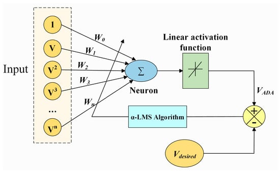 As previously mentioned, the novel resistive angle sensor exhibited hysteresis error between forward and reverse measurement strokes. To address this, an ADALINE network based on the α-LMS algorithm was used in this study to linearize the sensor’s forward and reverse curves. Ideally, the two curves tend to coincide, thus minimizing the hysteresis error. The sensor output was cascaded with the ADALINE model, whose inputs were the actual sensor outputs during angle increase and decrease. Here, instead of using the sensor output V directly as a single input to the network, V was expanded into a polynomial function involving terms [1, V, V2, …, Vn] to capture nonlinear relationships in the date and enhance the neural network’s learning ability. For an n-order model, the ADALINE model’s input is the expanded polynomial of V, with each term linked to weights [W0, W1, W2, …, Wn]. The weighted sum of the inputs was computed by the neuron, and the sum result was processed through a linear activation function to ultimately output VADA. The α-LMS algorithm compared VADA with the desired linear output Vdesired and calculated the error. Based on this error, the input layer weights were updated iteratively via backpropagation, and iterative optimization proceeded until the error goal was achieved. After neural network training, VADA approaches Vdesired [22,33,34]. The network’s response can be expressed by an n-order polynomial function: