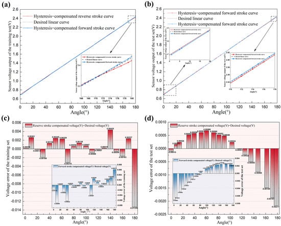 The results indicate that the MSE of the forward stroke in the test set is approximately 0.00121, and that of the reverse stroke is approximately 0.00106. For the training set, the forward stroke MSE is approximately 0.00116, and the reverse stroke MSE is approximately 0.00136. These data reveal that both the test and training sets exhibit very low MSE values for both stroke directions, and the MSEs under the same stroke conditions are remarkably close. This demonstrates that the neural network model developed in this study possesses excellent generalization capability without overfitting. Due to the random shuffling of the training data, which may cause incomplete overlap with the original input values, this paper employs interpolation alignment processing to compare the outputs at the same input values before and after hysteresis compensation. The comparison results of the sensor’s partial output voltages under forward and reverse strokes before and after hysteresis compensation are presented in Table 2. The sensor’s partial output voltages under forward and reverse strokes before and after hysteresis compensation. Figure 11a,b show the output voltage curves of the training set and test set under forward and reverse strokes after hysteresis compensation, respectively. To visually display the errors between the model-predicted voltages and the desired linear voltages before and after hysteresis compensation, bar charts are plotted as shown in Figure 11c,d. Figure 12a,b present the percentage nonlinearity error curves and percentage hysteresis error curves of the training set. Figure 12c,d show the percentage nonlinearity error curves and percentage hysteresis error curves of the test set.