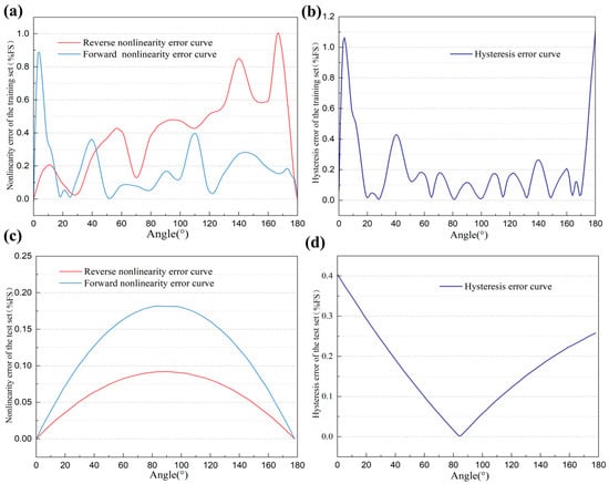 (a) The percentage nonlinearity error curves of the training set; (b) the percentage hysteresis error curves of the training set; (c) the percentage nonlinearity error curves of the test set; (d) the percentage hysteresis error curves of the test set.