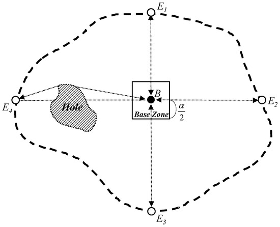 The Base Node B constructs the Base Zone with the length and then collects the locations of four edge nodes E1, E2, E3, and E4 on horizontal and vertical lines from itself.
