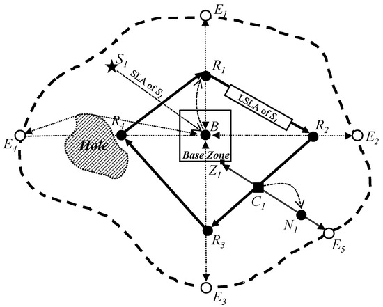 When the LSLA packet of S1 arrives at the sensor node R1 that is the closest node to the north intermediate destination, R1 changes the Destination field in the LSLA packet as the next IN Destination (for example, the east intermediate destination in Figure 3) and reduces the value of the Metric by one. Then, R1 sends the LSLA packet to the next IN Destination (i.e., east). This process is continued until the value of the Metric becomes zero. Eventually, the LSLA packet is returned to R1. In other words, if the Metric value is zero, it means that the LSLA packet has successfully traveled around the whole sensor network, which is a quadrilateral quorum R1R2R3R4 constructed by four random locations and includes the Base Zone inside itself. In this way, the proposed scheme can dispersively construct quadrilateral quorums of the SLA for sinks in the sensor network in order to achieve the balanced energy consumption of sensor nodes.