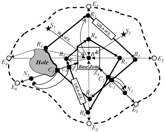 Our energy-balanced quorum-based sink location service scheme: a sink S1 constructs a quadrangle LSLA quorum connected by four random points R1, R2, R3, and R4. Then, a source N1 constructs a line SLQ quorum connected by a random point Z1 on the perimeter of the Base Zone inside the LSLA quorum and a random point E5 on the network perimeter outside the LSLA. Thus, the LSLA and the SLQ has a crossing point C1 between them.