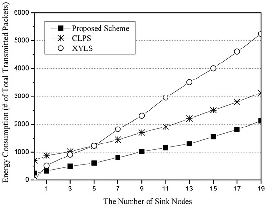 Figure 5 shows the energy consumption for the number of sinks. The x-axis represents the number of sink nodes (unit: nodes), and the y-axis indicates energy consumption, which is measured in terms of the total number of transmitted packets (unit: packets). As the number of sinks increase, XYLS consumes more energy than CLPS and the proposed scheme. In XYLS, every SLA quorum should be constructed along the network perimeter. However, CLPS and the proposed scheme do not require any perimeter forwarding. CLPS and the proposed scheme show similar graph slopes because SLA and SLQ distances are almost the same on average. However, the proposed scheme consumes less energy than CLPS due to the different cost of their network initialization phases. For network initialization, since XYLS does nothing, it has the minimum cost. In CLPS, the Base Node floods its location information to all sensor nodes in order to enable them to calculate their own circle height in the network. On the other hand, the Base Node in the proposed scheme just floods its location information into the small restricted area, the Base Zone. Although the proposed scheme additionally requests the location information of the four-way edge nodes, the flooding costs of CLPS are much bigger than those of the proposed scheme.