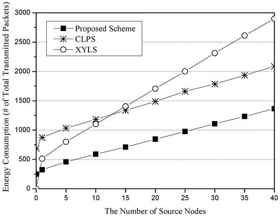 Figure 6 shows the energy consumption for the number of source nodes. The x-axis represents the number of source nodes (unit: nodes), and the y-axis indicates energy consumption, which is measured in terms of the total number of transmitted packets (unit: packets). XYLS consumes more energy than CLPS and the proposed scheme. The main reason is that a SLQ path of XYLS is twice as long as SLQ lines of CLPS and the proposed scheme in a worst case. However, due to high cost of the network initialization phase in CLPS, XYLS shows better performance than CLPS until the number of source nodes is 10. The proposed scheme consumes less energy than XYLS and CLPS because it has short SLQ paths (from a network edge to a perimeter node of the Base Zone) and low cost of the network initialization phase (restricted flooding within the Base Zone).