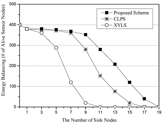 Energy balancing (i.e., the number of alive sensor nodes) for the number of sink nodes.