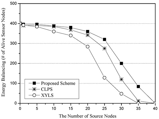 Energy balancing (i.e., the number of alive sensor nodes) for the number of source nodes.