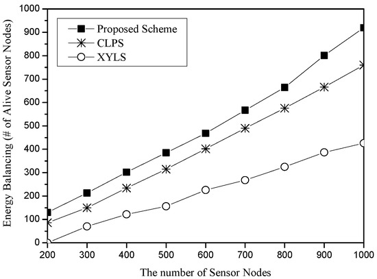 Energy balancing (i.e., the number of alive sensor nodes) for the number of sensor nodes.