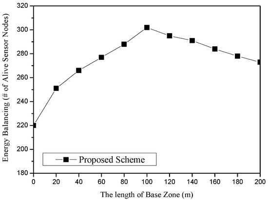Energy balancing (i.e., the number of alive sensor nodes) for the length of the Base Zone in the proposed scheme.