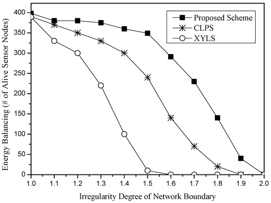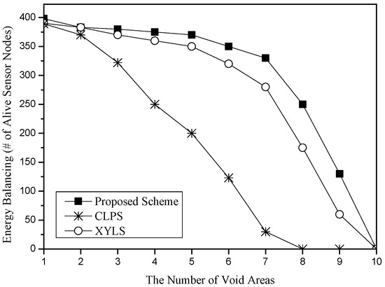 In Figure 11 and Figure 12, we compare the performance of these schemes for the network irregularity. The network irregularity is considered in terms of two cases, the irregularity degree of the network perimeter and the number of void areas. Figure 11 shows the energy balancing for the irregularity degree of the network perimeter. The irregularity degree of the network perimeter is defined as the ratio of the total perimeter length of the real network to the total perimeter length of the network of the circle. In the simulation, we consider the network of the circle with a radius 500 m. In Figure 11, as the irregularity degree of the network perimeter increases, the total length of the network perimeter also increases. Since XYLS is hardly affected by the distance of the network perimeter, it shows poor energy balancing. In CLPS, some SLA packets may travel along the partial network perimeter, especially in a large height circle. If there is another SLA packet that has a larger height than the circle, the energy of the sensor nodes of the partial network perimeter would be drained fast. However, since SLA packets of the proposed scheme stochastically travel along the network perimeter nodes, the scheme shows better energy balancing in terms of the irregularity degree of the network perimeter than other schemes.