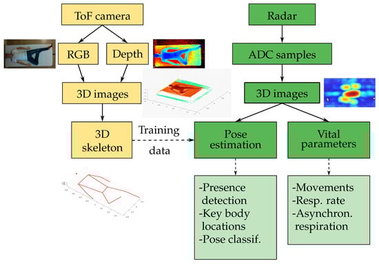 Overview of the main operations and functions with ToF camera data (yellow) and radar data (green).