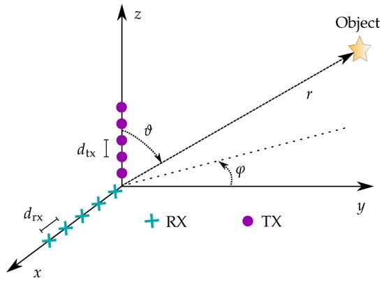 Due to the high computational load, direct reconstruction is often not the preferred technique. To simplify the signal model and the corresponding imaging method, the L-shaped antenna array used in this application was considered (see Figure 2). In this case, the TX elements were uniformly distributed on the z-axis at an inter-element distance of , and the RX elements were located on the x-axis with a spatial separation of . All scatterers were assumed to be in the far-field of the antenna array. By introducing a spherical coordinate system comparable to [37], where the locations of scatterers depended on the distance to the origin r, azimuth angle , and elevation angle , the received signals were