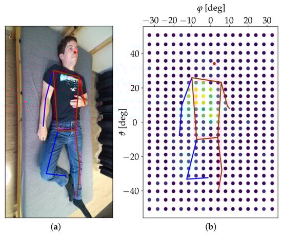 (a) RGB image from the Azure Kinect ToF camera used by a skeleton regression algorithm to calculate the reference data for joint positions. (b) Example of the values of the second phase evolution indicator extracted from the radar data in the azimuth–elevation plane with a person measured in supine position. Yellow color corresponds to the maximum.