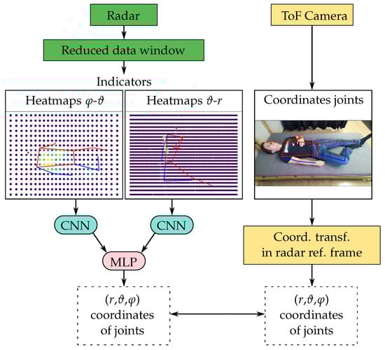 The ground truth data used to train and test the model were constructed based on the positions of the skeleton joints estimated from data collected with a Microsoft Azure Kinect DK ToF camera (RGB image and depth data). The estimation of shoulder and hip joints position was perfomed with Google MediaPipe Pose [31] applied to the RGB image. The obtained pixel coordinates were first transformed to the 3D Cartesian reference frame of the Kinect camera with the help of the measured depth data and then transformed to the radar reference frame. The positions of the xiphoid and navel were estimated directly from the shoulder and hip positions.