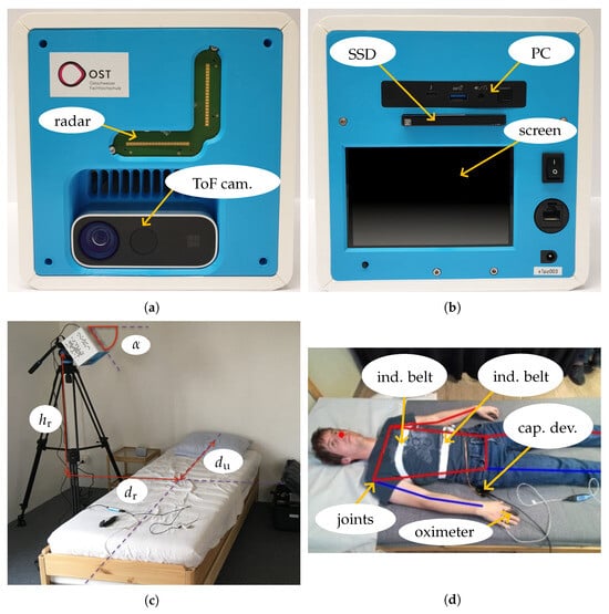 Measurement system in (a) front view and (b) rear view, (c) setup geometry next to the bed, and (d) reference systems for respiration and PPG signal with capturing device.