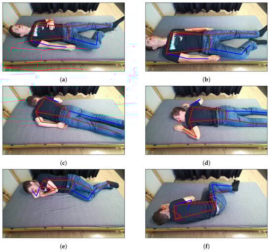 The first measurement consisted of changing the body position on the bed approximately every minute while lying in a relaxed position, breathing naturally, and not moving between the pose changes. For each person, 45 different poses were measured: 15 for each class (supine, prone, and lateral), of which three were with the person covered by a blanket. The poses differed by the positioning of the person on the bed surface, with some performed at the center of the bed and others closer to the four edges of the bed (top, bottom, and lateral), and by the locations of arms and legs. Some illustrative examples of the poses measured for one person are given in Figure 6. This first measurement was performed without reference systems (chest belts and PPG) and the resulting data were used only to train and test the pose estimation algorithms.
