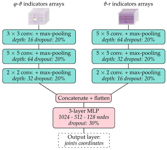The approach used to tackle the problem of localizing the key skeleton joints of the torso was inspired by the work presented in [32,33] and is summarized in Figure 4. The input of the model was a reduced radar data window and the output was an array containing the azimuthal, elevation, and distance coordinates of the xiphoid, navel, right shoulder, left shoulder, right hip, and left hip of the measured person. The azimuth–elevation and distance–elevation arrays of the five indicators , , , , and calculated from the radar data were first centered and normalized and then treated as separate input heatmaps (with five channels each) to a forked CNN architecture. Each of the two CNN forks was built out of three convolutional layers followed by a max-pooling layer and a dropout layer. The data from the two forks were then flattened, concatenated, and sent through a multilayer perceptron (MLP) with four dense layers, two dropout layers, and a final dense layer.