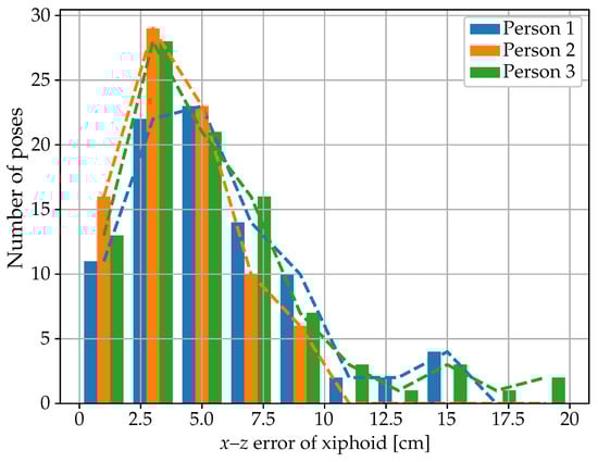 Frequency distribution of the localization error on the x–z plane of the xiphoid for the three people in the test set.