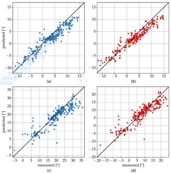 The main hyperparameters of the best model architecture for the joint coordinates regression algorithm, obtained after hyperparameter tuning with Optuna with 200 trials, are illustrated in Figure 7. The results obtained on the test dataset are summarized in Table 3 and Table 4 and Figure 8 and Figure 9. The mean absolute error (MAE) for the xiphoid and navel locations on the radar x–z plane was smaller than 5 cm, and more than 90% of the measured poses had an error smaller than 10 cm (Figure 8). As a baseline comparison, a model that estimated the mean value of the training dataset was evaluated on the test dataset and reached an MAE in the localization of the xiphoid of about 13 cm. The procedure was repeated with different choices of the three individuals used for the test dataset and similar results were obtained, with the mean absolute error in the localization of the xiphoid and navel varying between 3.5 cm and 8 cm depending on the person. For the three people in the test set, the azimuth and elevation angles are shown in Figure 9 in the upper and lower plots, respectively. The value on the vertical axis corresponds to the estimated angle and the value on the horizontal axis corresponds to the measured reference angle. A total of 288 poses is shown in the form of individual dots.