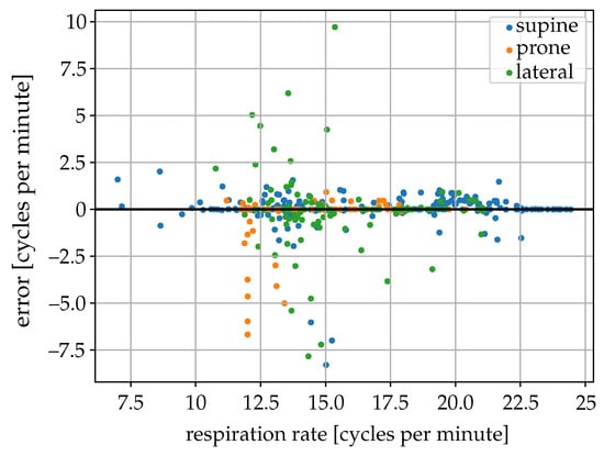 The estimated breathing rate from the radar data was compared with the estimate from the inductive belt signals for 512 different 2 min sequences without movements of seven different individuals in different poses (264 supine, 126 prone, 126 lateral) (Figure 10). The breathing rate measured with the inductive belts among the 2-min sequences used varied between 7 and 24 cycles per minute. In the supine position, an MAE of the estimated breathing rate of about 0.33 cycles per minute and a 90-percentile of the absolute error of 0.88 cycles per minute were obtained. In the prone position, the obtained MAE was 0.06 cycles per minute and the 90-percentile of the absolute error was 0.25 cycles per minute, whereas, in the lateral position these values were respectively 0.80 and 2.80 cycles per minute. Most of the sequences with errors larger than two cycles per minute, mainly in the lateral position and representing only about 3% of the sequences analyzed, were related to the low quality of the radar signal or the presence of disturbances (probably caused by very small body movements).