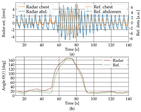 Simulated asynchronous chest–abdomen respiratory movement starting after 60 s with a person in supine position. (a) Comparison of the breathing movements at the chest (orange) and abdomen (blue) based on radar data (continuous line) and on inductive belts (dashed line). (b) Phase difference between the respiratory movement at the chest and abdomen estimated from the radar data (green) and inductive belts (red).