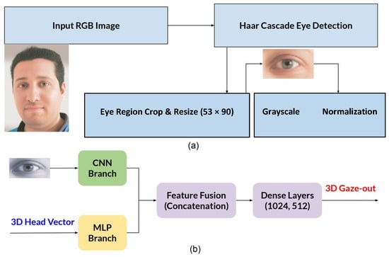 Our gaze estimation framework (Figure 1) uses a dual-branch architecture combining a CNN and an MLP for accurate 3D gaze prediction. As shown in Figure 1a, input RGB images are first processed using a Haar cascade-based method [40] with OpenCV’s version 4.11.0 pre-trained eye detector [41], which has shown reliable performance in real-time applications [42].
