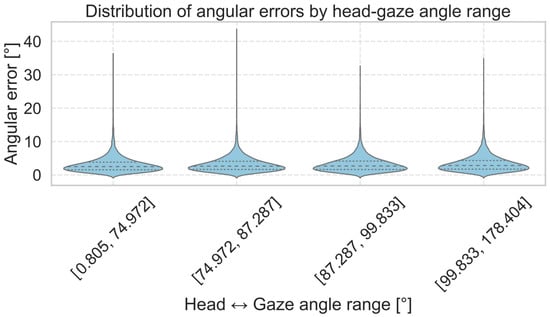 Figure 5 and Figure A3 show the distribution of angular errors relative to the angle between the head orientation vector and the ground-truth gaze direction for the MPIIFaceGaze, EyeLis, RT-GENE and UnityEye datasets. The horizontal axis represents the angle between the head and gaze, divided into four quantile-based bins, while the vertical axis shows the corresponding angular error in degrees.