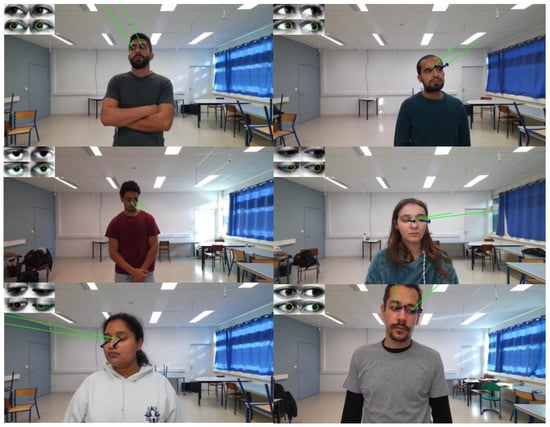 Gaze direction is a critical source of information for assessing individuals’ intentions and behaviors; it allows for the real-time inference of human intent, particularly regarding attention and engagement. For example, observing an individual’s gaze direction can provide valuable insights into their level of fatigue [1], support gaze prediction in contexts such as driving [2,3], or, in the medical domain, help to evaluate levels of intentionality in patients with neurological or other disorders [4]. Moreover, beyond the analysis of spontaneous human behaviors, gaze estimation also plays a significant role in controlled interaction settings, such as wheelchair navigation [5], activation of mechatronic systems [6], and medical robotics, notably in the control of robotic arms [7].