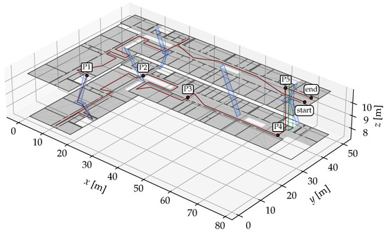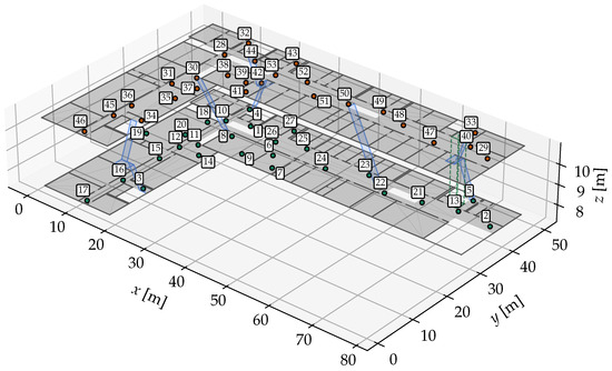 Here, is a reference RSS measured at a distance (usually 1 m) and is a constant attenuation factor. marks the number of floors or ceilings, respectively, between the transmitter and the receiver. Walls and other obstacles could also be considered for the attenuation [21]. However, since they would impact the computational effort much more, they are omitted here. For each AP, the parameters , and are optimized together with the position of the AP. This way, it is ensured that the signal propagation of each AP is represented best by the corresponding function. When applying the function, d and can be derived by knowing , which is contained in . If the AP position within the map is known, it is accepted as a prior but still included in the optimization process. To evaluate a particle and update its weight, a Gaussian distribution with a user-defined noise variance is assumed with the RSS function value for each AP. The current incoming measurement from each AP is then evaluated against this function.