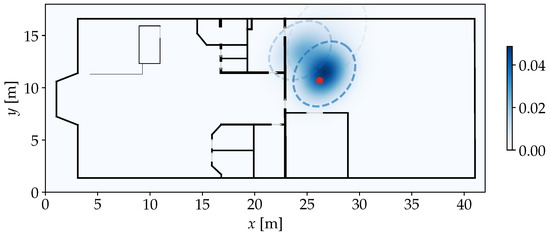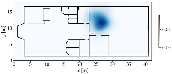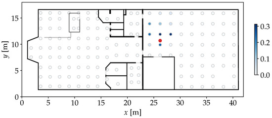 The length-scale parameter l controls how different two compared values can be considered similar. In this model, . By applying the kernel on each row of to compare it with , a similarity vector of length is constructed. For the ith FP in the model and therefore the ith element in , determines the probability that was observed somewhere near the position . An example for this step is given in Figure 3, where the highest similarities are assigned nearby the position where the actual observation was made. The use of a kernel as similarity measure is different from most established models that use a Euclidean distance measure, which represents a dissimilarity instead [4,5,24]. However, for the upcoming steps of our approach, it is more practical to have an actual similarity measure. When it comes to weighting particles of a PF, a high similarity should correspond to a high weight, indicating a high probability of the particle’s state.