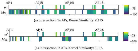 Similarity computation with RBF kernel () for an observation with two different FPs, using only elements present in both vectors. Values are the mean aggregations of Wi-Fi RSSI [dBm] per AP from a real-world scenario, showcased in Figure 1. The intersecting features are marked in red. The FP in Figure 4a has a higher intersection and appears visibly similar to . But here, the kernel similarity over the intersecting features is lower than with the FP in Figure 4b with just minimal intersection.