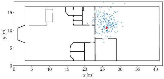 Position samples generated based on the FPs and similarities from Figure 3 with and . The red marker stands for the position where the observation was recorded before. The noise causes the samples to spread out over the area between the FP positions that have a high similarity. The spread also causes a few samples to lay in another room or outside of the building.