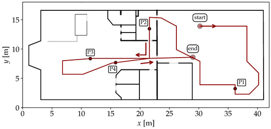 We use the university building from Figure 1 as our second experimental environment, with the GT path shown in Figure 9. For both the FPs and the recording, a Google Pixel 2 XL smartphone was used. This scenario is more challenging but also more realistic than the first one. There are 49 FP positions, which are much less densely distributed than in the first scenario. There are two floors that need to be correctly identified via their corresponding r. Especially challenging are floor changes, either by stairs or by elevator. The only available radio source is Wi-Fi from the building’s existing mesh. In total, 181 APs were identified by their MAC addresses in the FP dataset. The path starts on the top floor, at the longer end of the corridor, and continues almost the entire way until it turns into a dead end on the right. After a 180° turn, it passes a small office and a lecture room on the opposite side. It then re-enters the corridor and turns left into the more open, shorter segment of the corridor and crosses through a seating area. At the end of this area, a left turn leads down a staircase to the lower floor. A further 180° turn is made at the left end of the corridor, then the path passes another lecture room to get to the longer segment of the floor. After going around a floor cut-out, another lecture room and laboratory is passed. Then, the path goes to the longer end of the building into the elevator, which is taken upwards. Here, the path ends nearby the starting position.