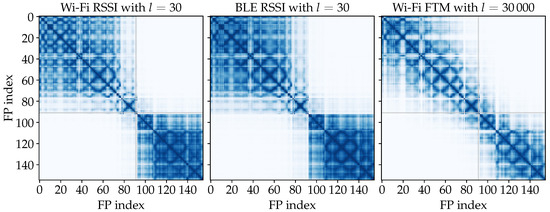 The ObsSim model produces estimates based on the similarity of FP observations. A visualization of the pairwise similarities between the FP observations themselves for the data from scenario #1 is given in Figure 10. The diagonal grid pattern that is present for each signal is due to the grid scheme in which the FPs are ordered and enumerated row by row (see also Figure 3). The two well-defined clusters for Wi-Fi and BLE RSSI correspond exactly to the two large rooms into which the building is divided. This confirms the effect of walls attenuating the signal. There is no such clear separation in the FTM observations. Here, the effect of obstacles is still noticeable, but much less intense.