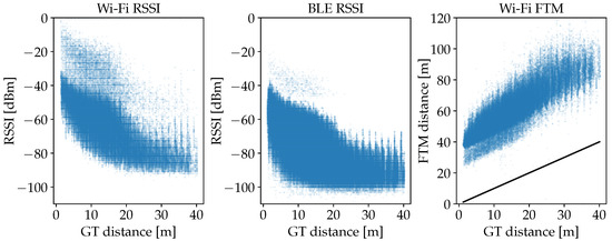 The distribution of FP measurements against the actual distances to the respective APs is plotted in Figure 11 for each measurement type. For Wi-Fi and BLE RSSI, the significant dip of the maximum values at about 20 m can be explained by the dimensions of the building. Measurements with distances beyond 20 m are therefore attenuated by at least the wall in the center of the building (see also Figure 8). Thus, above 20 m, the overall spread is also increased significantly for FTM. The smaller and visibly delimited sets of points that occur especially between 0 m and 20 m for the Wi-Fi data, are due to device-specific characteristics, since measurements from three different smartphones are included in the dataset. Remarkable is the consistent offset of about 50 m for FTM. The consistency of this error pattern is also present in the literature [9,22]. Processing delays in the AP add to the RTT and extend the calculated distance by almost always the same value. We are going to consider this effect during the experiment with the plain FTM distance model.