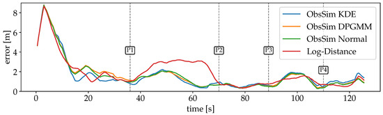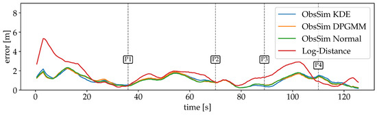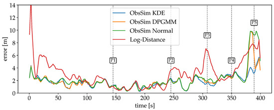 For the first scenario with Wi-Fi RSSI measurements, the errors are plotted over time in Figure 12. The large error at the beginning of the recording is due to a dropout of measurements. Since the particles are uniformly spread over the entire space, the PF has no indication of the absolute position during this time. Also, the first incoming observation leads to a significant peak after a few seconds, because the first position estimate is quite far off. But as soon as valid observations are available, the estimates converge close to the GT and are able to keep up well over the remaining time. The Log-Distance error is larger for a longer period (P1-P2). A possible explanation is that some crucial information from the FPs is lost during the optimization of distance functions per AP. While this model is minimalistic and robust, some details are lost that are still considered by ObsSim. The smallest error is between P2 and P3 where the path goes through a narrow kitchen and a small corridor to the more open office space.