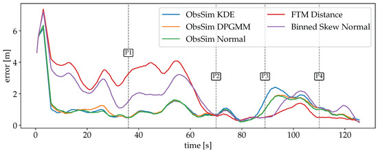 A visualization of the accuracy over time for each model is shown in Figure 15. As with the Wi-Fi RSSI data (see Figure 12), there is a peak at the beginning for each model due to the measurements that start arriving after a few seconds of the recording. The clear separation of the three models in the first half is in line with the previously expected behavior. The plain FTM Distance model provides the worst generalization due to the superficial assumption of a static offset. The Binned Skew Normal FTM model takes into account the distribution of values depending on the true distance, and is therefore more accurate. By far the highest accuracy is achieved with the ObsSim model, with each density estimation method performing almost equally well. In the second half, which takes place on the other side of the building, all models behave differently. Here, all error curves are closer together, with the ObsSim model getting slightly worse and the FTM Distance model significantly better than before. This shows that the FTM Distance model is indeed able to achieve good results when the corrected measurements match the true distance, but this is obviously not always the case. As with Wi-Fi RSSI, the lowest overall errors are achieved between P2 and P3 and then after P4, in the narrow section of the building. The ObsSim model can generalize much better by focusing on the overall pattern of all reachable APs and not trying to estimate all distances independently.