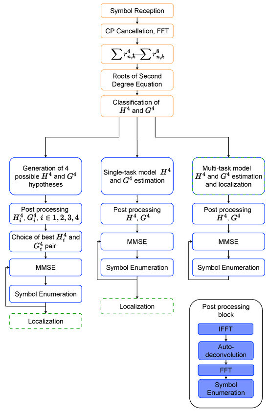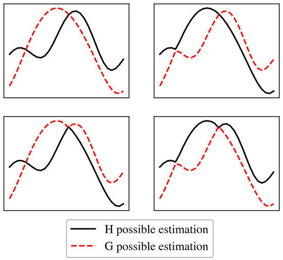 In order to obtain the channel information from the received signal relevant to the localization task, the first stage of the receiver consists of carrying out the cyclic prefix (CP) cancellation followed by a fast Fourier transform (FFT). Taking into account the statistical properties of the used modulations and additive white Gaussian noise, we calculate and . Combining the two equations, we obtain a second-degree equation whose unknown variable is either or . Solving this leads to a set of roots, and the primary challenge is determining which one is and which one is . This presents the main limitation of the solution, as the initial study assumes at most two crossover points, resulting in possible combinations, as illustrated in Figure 2. Evaluating all possible combinations of crossovers between the frequency responses would quickly become intractable.