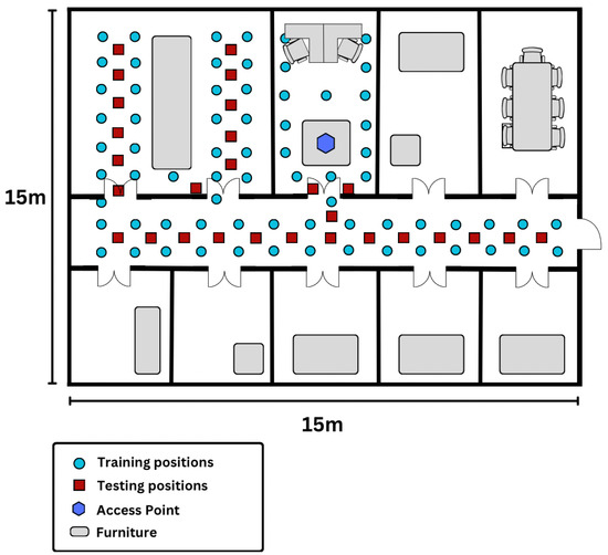 A secondary dataset consists of CFR measurements recorded during a collection conducted in a university laboratory in Paris. Figure 4 depicts the floor plan of the 15 m × 15 m laboratory, including a main corridor and several adjoining offices and meeting rooms. An HP laptop served as the signal transmitter, stationed on a table within the central office room. Operating in injection mode, the laptop transmitted intermittently at a rate of 100 packets per second. This setup proved highly effective for our laboratory environment; however, provisions are in place to incorporate multiple transmitters for future expansions.