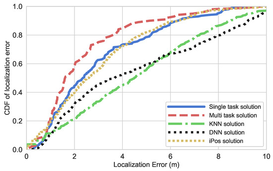 To evaluate the performance of our proposed multi-task network for localization, we compare its results with different CSI-based fingerprint algorithms. We consider a weighted K-nearest neighbors (WKNN) algorithm, a traditional fully connected deep neural network (DNN), and the state-of-the-art localization solution iPos-5G [22], as these represent a range of traditional and advanced approaches in the field. The iPos-5G paper presents a deep learning indoor localization solution using 5G CSI. In the offline phase, a preprocessing step is applied to the fingerprints in order to reduce the CSI noise, applying cross-correlation analysis, wavelet denoising, and Hampel filtering. The denoised CFR data is used to train a denoising autoencoder, which learns a compressed representation of the fingerprint data. During the online phase, the test CSI samples are processed using the denoising steps and are then fed through the autoencoder model. The receiver’s position is estimated using a probabilistic model, and the denoised CFRs are compared to stored fingerprints using a supervised radial basis function (S-RBF) kernel to obtain a similarity metric. According to the study, iPos-5G improves accuracy by 16–37% when compared to alternative methods.