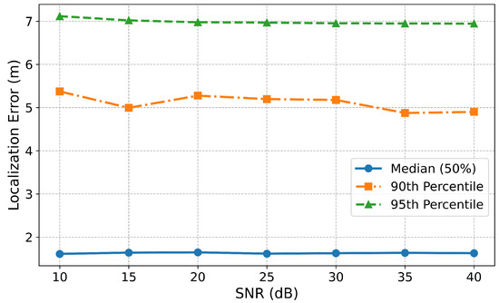 To further evaluate the model’s behavior under different noise conditions, Figure 8 shows how the median, 90th, and 95th percentile localization errors vary with SNR for the multi-task model on the NYUSIM dataset. The observed stability in both median and higher-percentile errors suggests that the model’s performance is not significantly affected by the SNR variation used during training and evaluation due to the incorporation of different levels of noise during the training phase of the model, as the model was trained on a dataset spanning multiple SNR levels (from 10 dB to 40 dB).